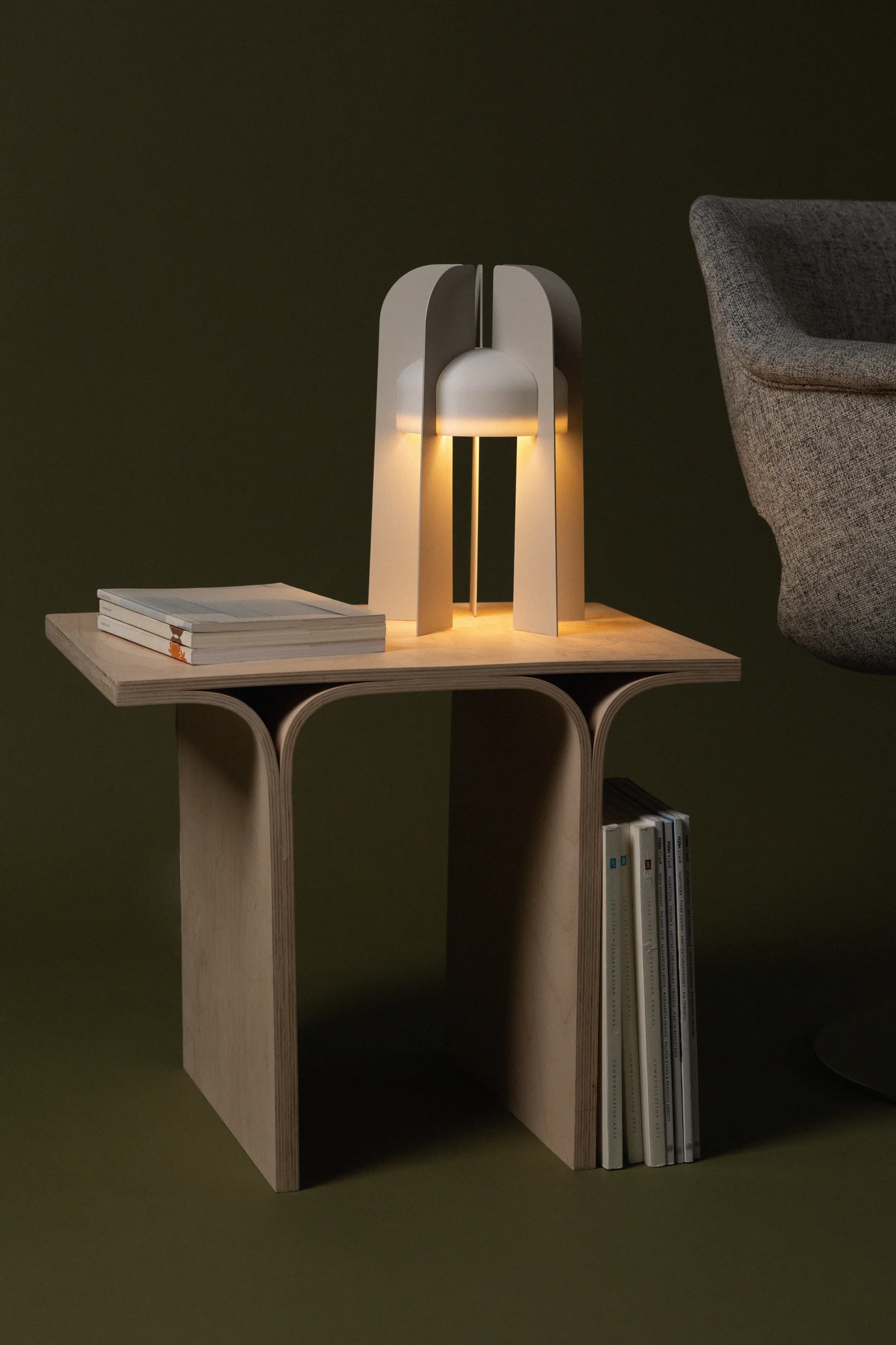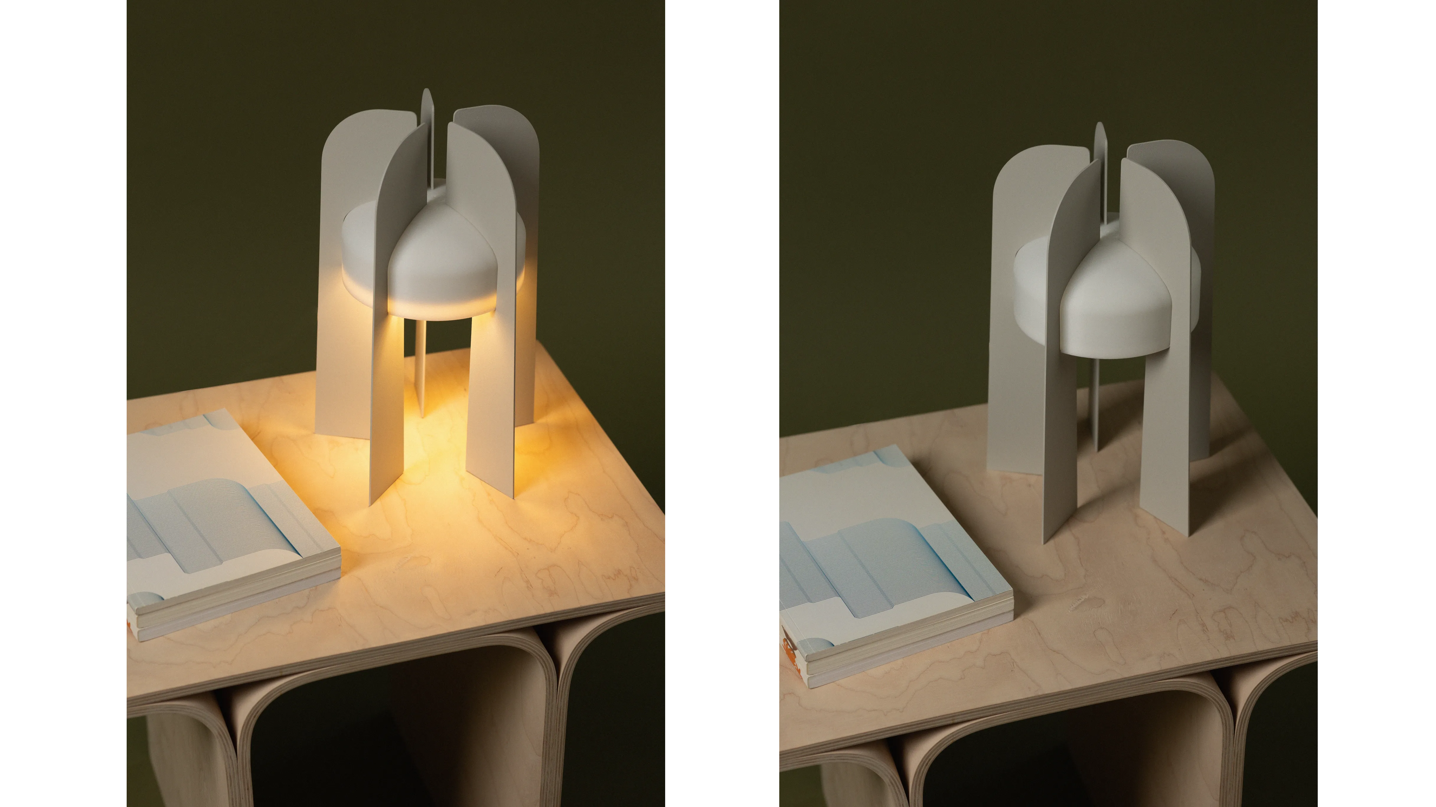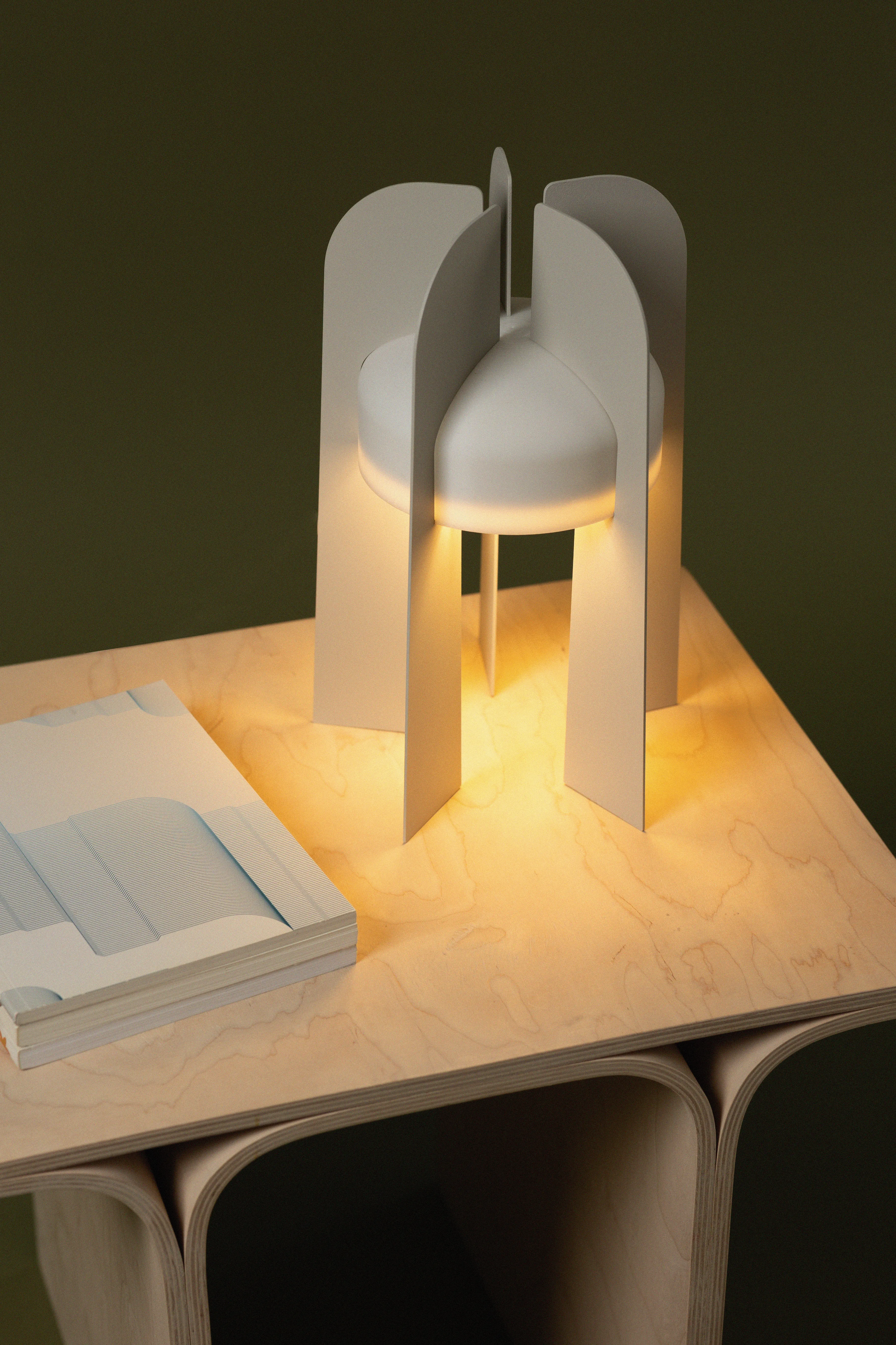 Nuppu is a table lamp that projects light into the surroundings through its surface and the blades surrounding the lamp. It is made from aluminum and PLA plastic.